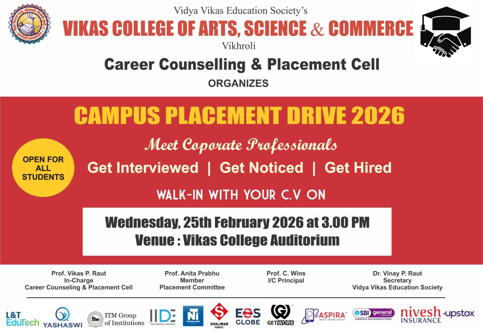 Vikas College of Arts, Science & Commerce β nurturing careers since 1986. An ISO 9001:2015 certified institution affiliated to the University of Mumbai, Vikas College combines strong academics with career-oriented programs across Commerce, Arts, Science and professional self-financed courses to prepare students for todayβs competitive world.